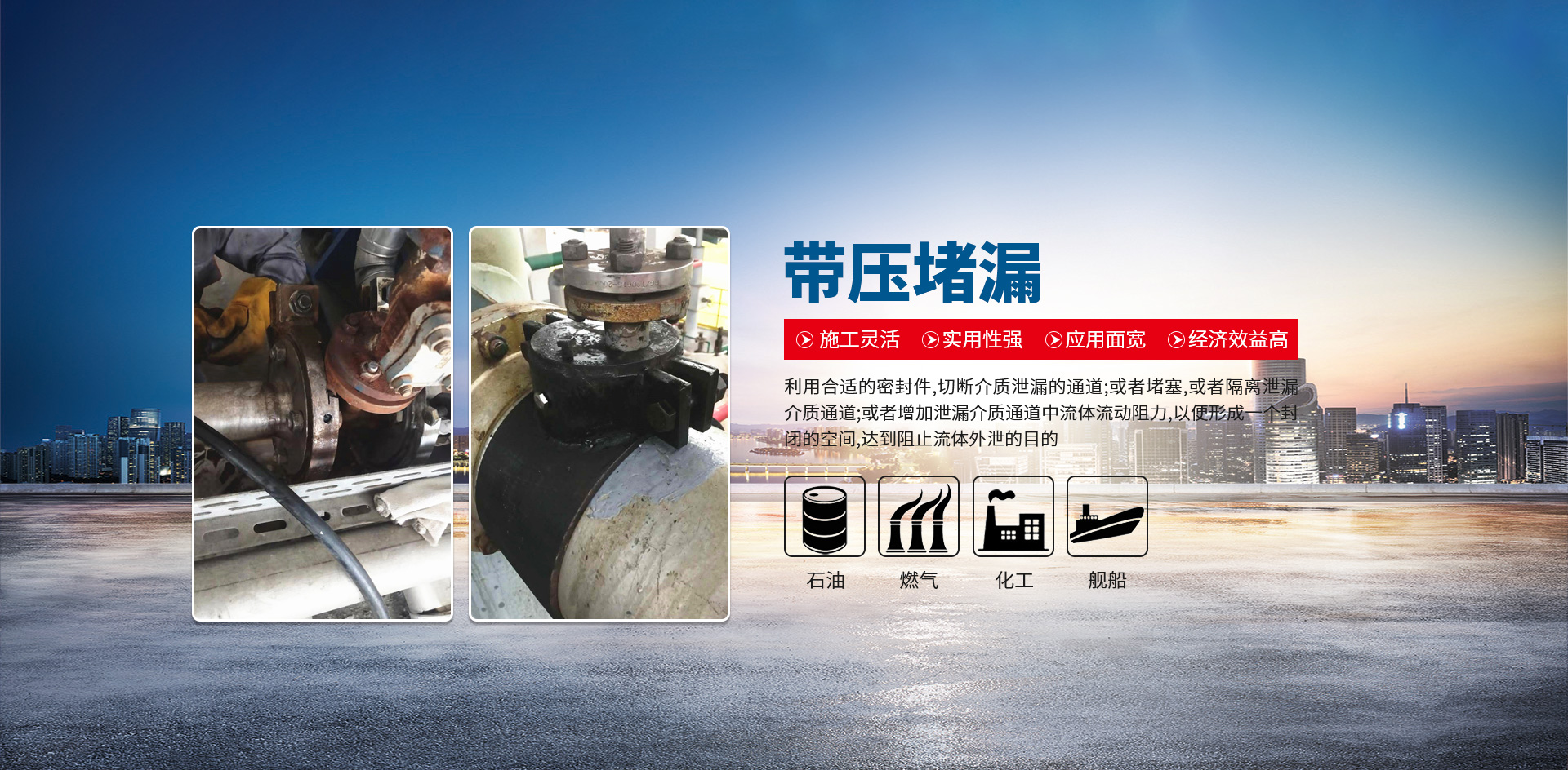 專業(yè)從事堵漏工程,管道設(shè)備維修,管道帶壓開孔,管道帶壓封堵,管道帶壓堵漏,管道設(shè)備清洗等業(yè)務(wù)。